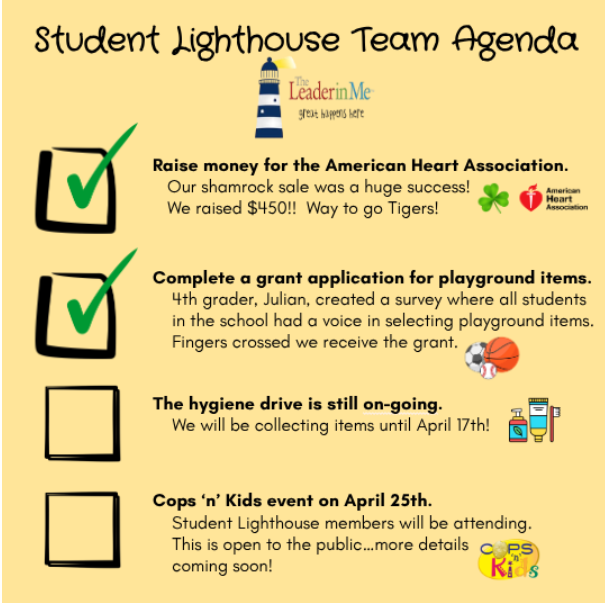 Student lighthouse team members are involved in both school and community events. Students lead assemblies, assist in tracking and recording school attendance, guide tours, and complete various service projects to help those in need.